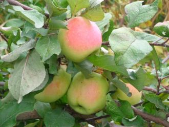 Основной окрас плодов желтовато-зеленый, покровная окраска - буровато-красный румянец с освещенного солнцем бочка яблока.